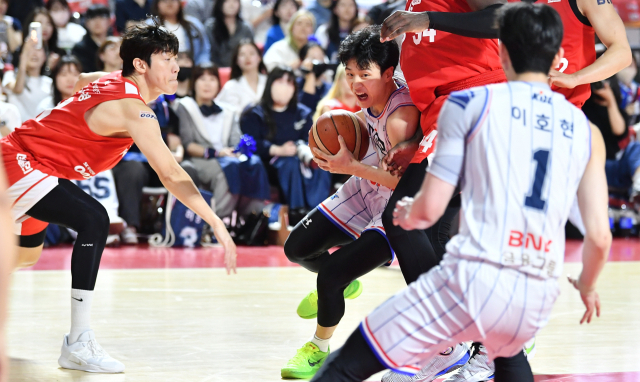 KCC 허웅(가운데)이 6일 KBL 6강 플레이오프 2차전에서 SK 수비진 사이로 돌파를 시도하고 있다. KBL 제공
