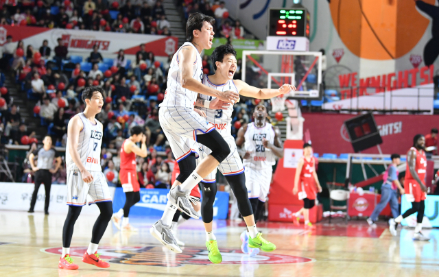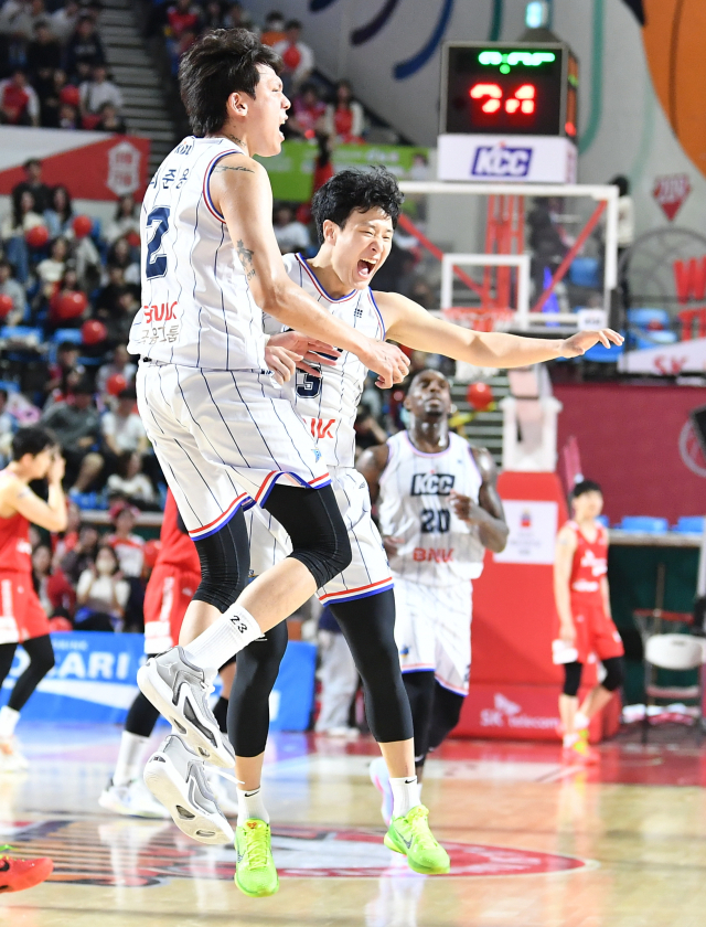 KCC 허웅(가운데)이 6일 KBL 6강 플레이오프 2차전에서 득점에 성공한 뒤 최준용과 함께 기뻐하고 있다. KBL 제공
