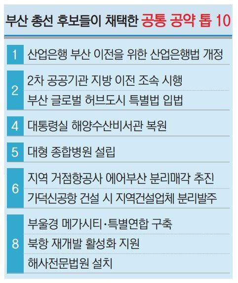 전문가 그룹인 〈부산일보〉 ‘총선자문단’이 ‘총선특별취재팀’과 함께 유권자가 제안하는 공통 공약을 ‘블라인드’ 방식으로 평가했을 때도 ‘2차 공공기관 지방 이전 조속 시행’과 ‘산은 부산 이전을 위한 산은법 개정’이 각각 1, 2위를 차지했다. 공동 2위에 오른 부산 글로벌 허브도시 특별법 입법의 경우 21대 국회에서 여야 부산 의원들이 모두 법안 발의에 참여했고 여야 지도부도 처리에 긍정적인 상태다. 이 때문에 부산 총선 후보들도 소속 정당과 지역을 넘어 공약으로 채택했다.
