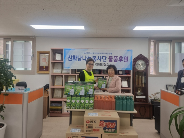 신화남나눔봉사단은 지난 8일 부산연제구장애인협회(회장 이영숙)에 600만 원 상당의 생필품과 라면 등을 전달하는 나눔 행사를 가졌다.