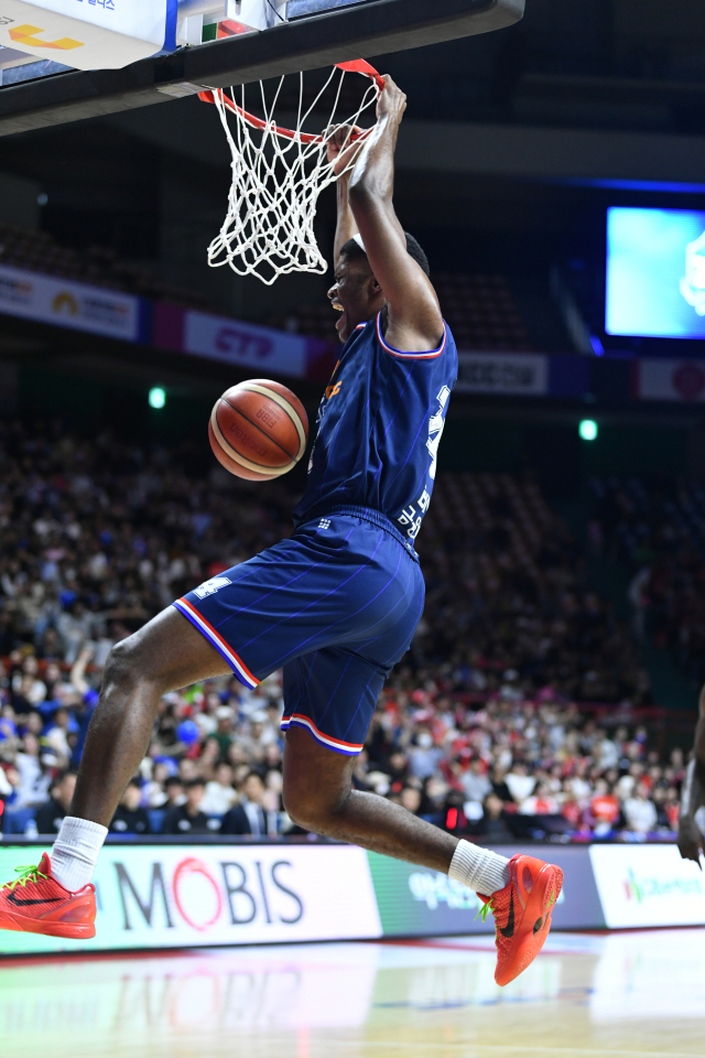 KCC 존슨이 8일 오후 부산 사직실내체육관에서 열린 SK와 KBL 6강 플레이오프 3차전에서 호쾌한 덩크슛을 터뜨리고 있다. KBL 제공