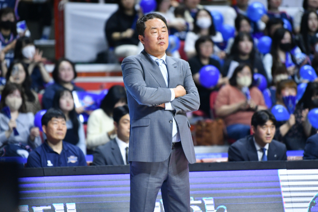 KCC 전창진 감독이 8일 오후 SK와 KBL 6강 플레이오프 3차전에서 선수들의 경기를 지켜보고 있다. KBL 제공