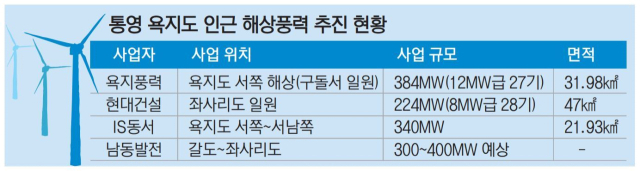 현재 욕지도를 중심으로 추진 중인 대형 프로젝트만 4건, 예상 계획 면적은 130㎢로 국제경기가 가능한 축구경기장 2만 2000여 개를 펼친 규모다. 해상풍력은 수심 20~50m에 평균 풍속이 초속 6m를 넘어야 사업성이 확보되는데, 욕지도는 동·서·남해안을 통틀어 이를 충족하는 몇 안 되는 최적지로 손꼽힌다.