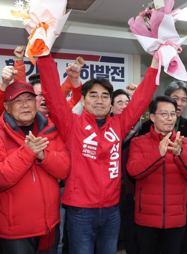 부산 사하갑 국민의힘 이성권 당선인이 11일 새벽 당선이 확실시되자 꽃다발을 받고 환호하고 있다. 정종회 기자 jjh@