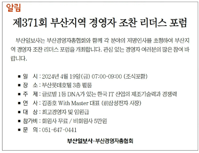 부산일보사는 부산경영자총협회와 함께 각 분야의 저명인사를 초청하여 부산지역 경영자 조찬 리더스 포럼을 개최합니다. 관심 있는 경영자 여러분의 많은 참여 바랍니다.