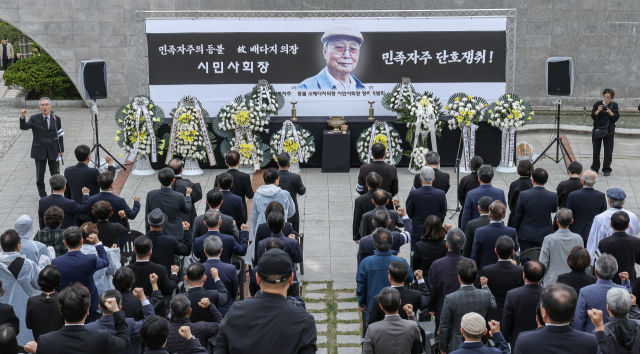 배다지 겨레의길 민족광장 상임의장의 영결식이 15일 부산 민주공원에서 시민사회장으로 엄수됐다. 부산에서 민주화·통일 운동에 앞장서 온 고인은 지난 13일 향년 90세의 일기로 별세했다.