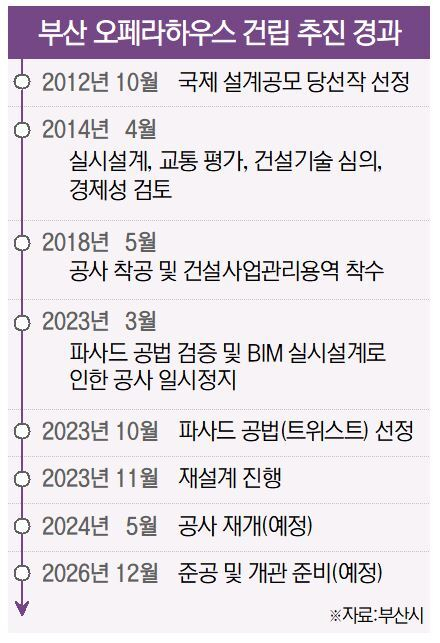 설계 공법을 둘러싼 논란으로 1년 넘게 건설이 멈췄던 부산오페라하우스 공사가 다음 달 재개된다. 시는 오페라하우스 공사가 정상궤도에 오르면 오는 2026년 12월 공사를 마무리하고 본격적인 개관 준비에 나서기로 했다.