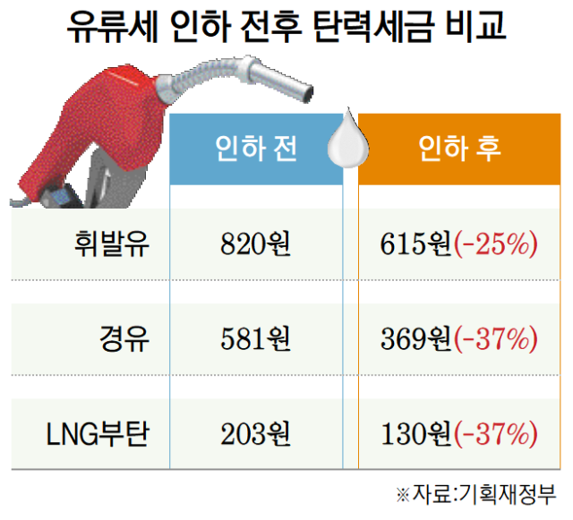 경유와 액화석유가스(LPG)부탄에 대해서는 37% 인하율을 유지한다. 경유는 L당 369원(212원 인하), LPG 부탄은 130원(73원 인하)의 유류세가 2개월 더 유지된다.