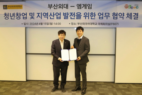 부산외국어대학교(총장 장순흥)는 ㈜엠게임(대표 권이형)과 지난 15일 청년창업 및 지역산업 발전을 위한 업무협약을 체결했다고 16일 밝혔다.