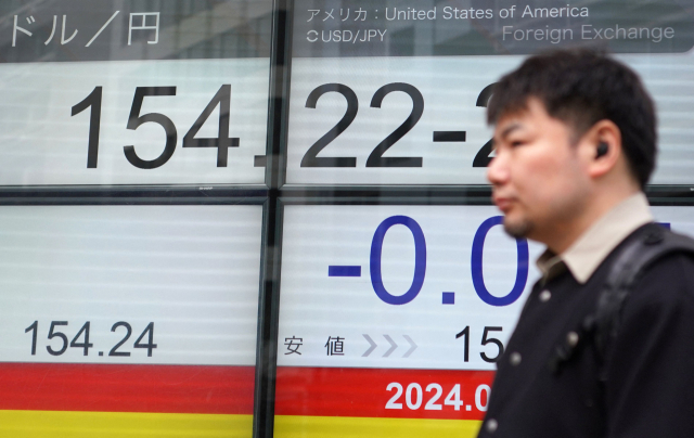 16일 일본 도쿄 시내에서 한 남성이 외환 시세 전광판 앞을 지나가고 있다. 이날 엔·달러 환율은 1990년 6월 이후 34년 만에 최고치인 달러당 154엔대 중반까지 치솟았다. AFP연합뉴스