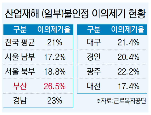 부산이 산업재해로 인정되지 않은 사건에 대한 이의제기율이 가장 높은 것으로 나타났다. 일부 질환에 대한 산업재해 인정률도 전국 평균보다 낮은 것으로 조사됐다. 부산 노동계는 산업재해에 인색한 실태를 바꿔야 한다고 비판하고 나섰다.