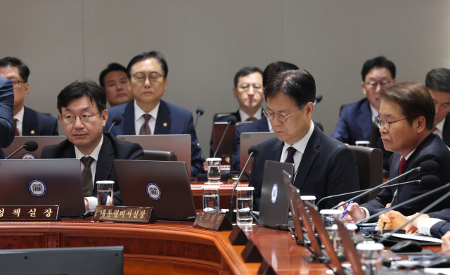 성태윤 대통령실 정책실장(왼쪽부터), 이관섭 대통령 비서실장, 이정식 고용노동부 장관 등이 지난 16일 서울 용산 대통령실 청사에서 열린 국무회의에 참석하고 있다. 연합뉴스