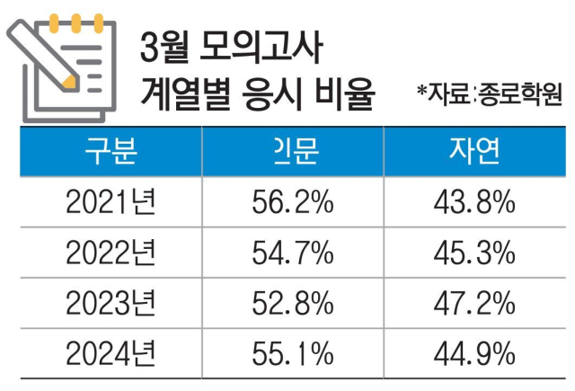 지난달 28일 고3 학생을 대상으로 치러진 2025학년도 3월 서울시교육청 주최 모의고사에서 인문계열 응시 학생 수는 늘고, 반면 자연계열 학생 수는 줄어든 것으로 나타났다. 3월 모의고사에서 고3 학생이 선택한 계열은 인문계열 55.1%, 자연계열 44.9%였다. 인문계열은 탐구 영역 중 사회탐구를, 자연계열은 과학탐구를 선택한 학생으로 구분했다.