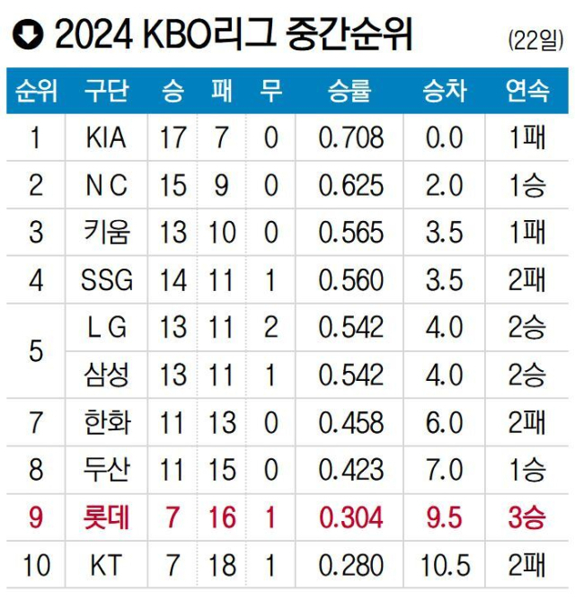 앞서 롯데는 지난 18일 LG 트윈스전에 모처럼 대량 득점하며 기나긴 8연패 수렁에서 벗어났다. 이어 주말 사직 3연전에서 KT 위즈를 상대로 2승 1무를 거두며 기세를 탔다.