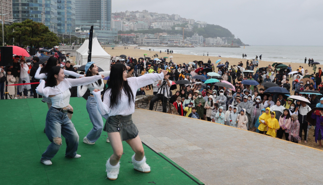 ‘맨발걷기 좋은 도시 부산 선포식 및 세븐비치 어싱 챌린지’가 21일 오후 부산 해운대해수욕장에서 열렸다. 이날 행사에 앞서 4인조 K팝 댄스그룹 모벤티가 식전 공연을 펼치고 있다. 정종회 기자 jjh@