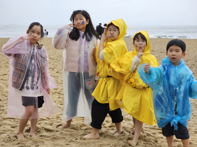 페이스 페인팅을 한 어린이 참가자들이 해운대 바다를 배경으로 기념 촬영을 하고 있다. 조경건 부산닷컴 기자