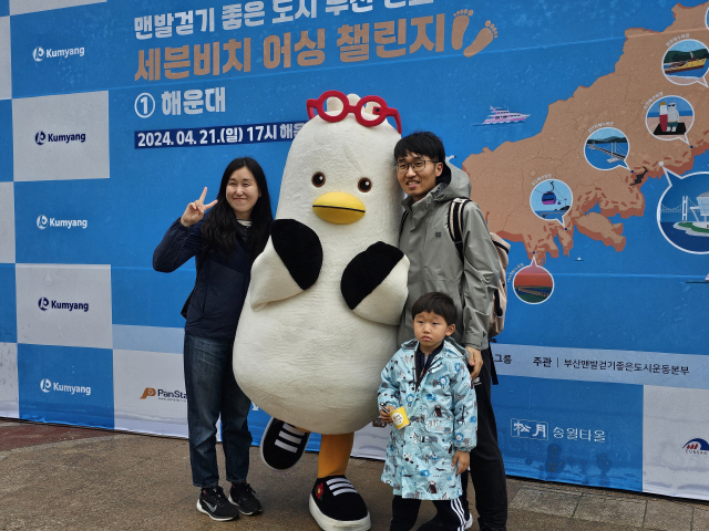 부산시 캐릭터 ‘부기’와 함께 인증샷을 남기고 있는 가족 단위 참가자. 조경건 부산닷컴 기자