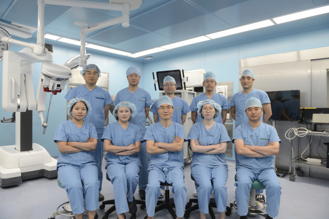 동아대병원 로봇수술센터 의료진과 최근 도입한 다빈치 SP 단일공 로봇 시스템. 동아대병원 제공