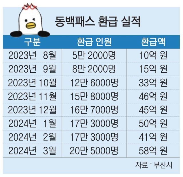 동백패스 가입자는 지난 21일 기준 42만 2000명이다. 환급 인원은 지난해 9월까지 10만 명 미만에 그쳤으나, 부산 대중교통 요금이 오른 지난해 10월부터는 10만 명을 넘겼다. 지난달에는 개학·개강 등 여파로 환급 인원이 20만 명을 넘겼다. 현재 가입자 수와 환급 인원이 늘어나는 추세이나, K패스가 시행되면 이용자 수가 줄어들 수 있다는 전망이 나온다.