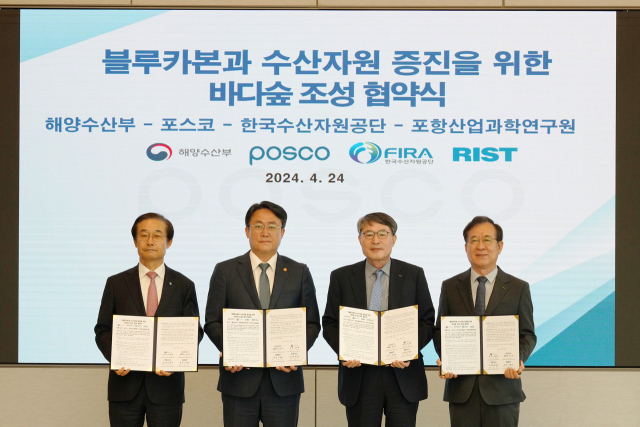 해양수산부는 24일 서울 강남구 포스코센터에서 바다숲 조성의 민관 협력 활성화를 위해 포스코, 한국수산자원공단, 포항산업과학연구원(RIST)과 ‘블루카본과 수산자원 증진을 위한 바다숲 조성 업무협약(MOU)’을 체결했다.