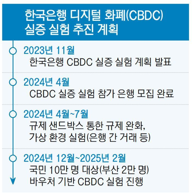 한은과 금융당국은 논의를 거쳐 오는 7월까지 금융 규제 샌드박스 승인 절차를 거쳐 은행의 CBDC 관리와 관련된 규제를 풀고 실험을 진행할 방침이다. 12월 국민 대상 상용화 실험에 앞서 금융기관 간 가상 환경에서 거래 실험도 진행한다.
