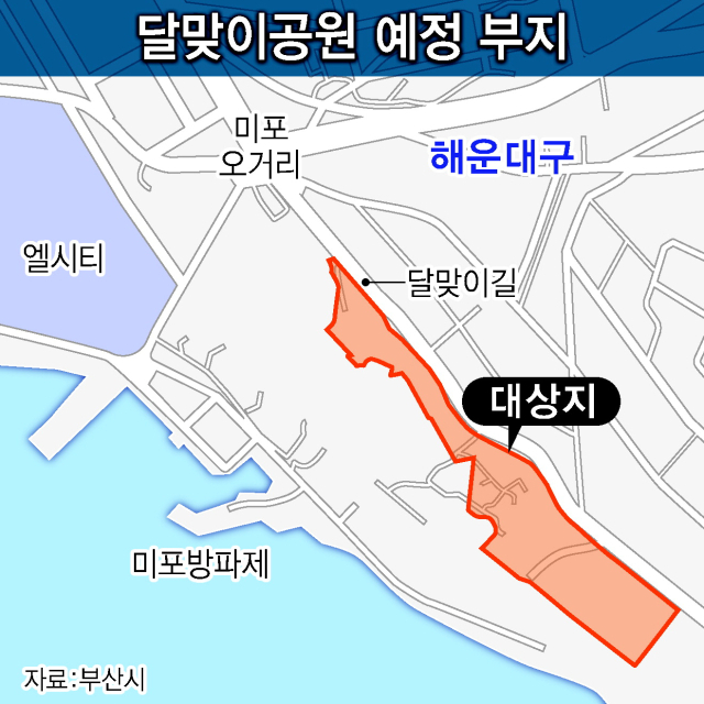 부산시는 오는 6월까지 달맞이길 일대 사유지 보상 절차를 마무리하고 소유권 이전을 완료할 계획이라고 24일 밝혔다. 달맞이공원은 달맞이길 입구에서 청사포까지 3만 3427㎡(1만여 평) 규모다. 시는 올해 예산 확보·조성 계획 확정을 거쳐 내년 1월 착공할 예정이다. 완공 예정 시점은 내년 10월이다.