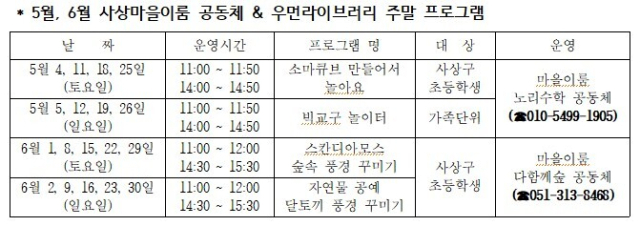 해당사업은 6개 마을이룸 교육공동체가 함께 우먼라이브러리(사상구 광장로 19, 이마트 사상점 앞)에서 4월부터 12월까지 매월 주말(토, 일), 환경, 자연, 업사이클링 등을 주제로 다양한 프로그램을 진행하는 사업이다.