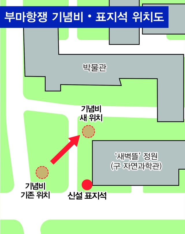새벽뜰 개장으로 박물관이 모습을 드러내며 표지석도 그에 걸맞게 위용 있는 모습으로 새롭게 세워졌다. 부마민주항쟁 발상지에 이를 기념하는 표지석을 세우자는 정 씨의 염원이 45년 만에 비로소 성사된 것이다. 표지석에는 ‘부산대 학생이 부마민주항쟁에 불을 붙인 역사적 장소’라는 내용이 담겼다.