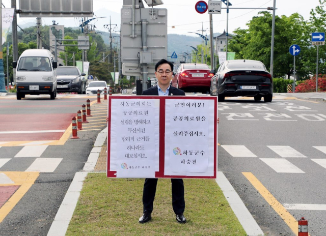28일 하동군에 따르면 하승철 군수는 지난 26일 하동군의회 앞 광장과 읍 로터리에서 1인 시위를 진행했다. 하 군수가 직접 시위에 나선 건 군의회가 하 군수 공약사업인 ‘종합병원급 보건의료원 건립’에 연이어 제동을 걸었기 때문이다.