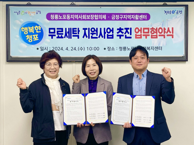 부산 금정구 청룡노포동 지역사회보장협의체(민간위원장 이종수)는 지난 24일 찾아가는 맞춤형 무료 세탁 사업인 ‘행복한 청포, 무료 세탁 지원 사업’ 추진을 위해 금정구 지역자활센터(센터장 신요한)와 업무협약을 체결했다.