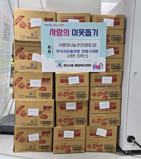 연제구 연산4동(동장 김외경)은 지난 26일 강생일 한국자유총연맹 연제구지회 장으로부터 라면 15박스를 기탁받아 홀로 어르신 등 취약계층에 전달할 예정이다.