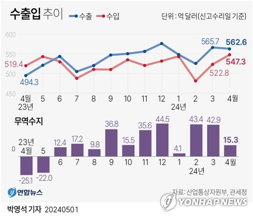1일 산업통상자원부가 발표한 ‘2024년 4월 수출입 동향’에 따르면 지난 4월 수출액은 작년 같은 달보다 13.8% 늘어난 562억 6000만 달러, 수입액은 5.4% 증가한 547억 3000만 달러로 집계됐다. 이로써 4월 무역수지는 15억 3000만 달러 흑자를 기록했다.