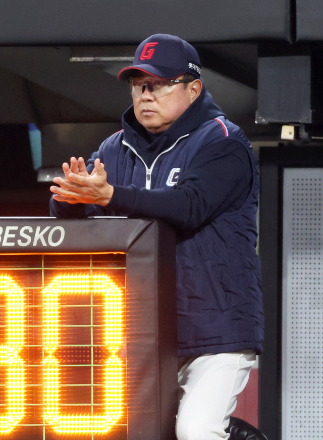 롯데 자이언츠 김태형 감독이 3월 27일 광주 KIA챔피언스필드에서 열린 KIA 타이거즈와 경기에서 손뼉을 치며 선수들을 응원하고 있다. 연합뉴스