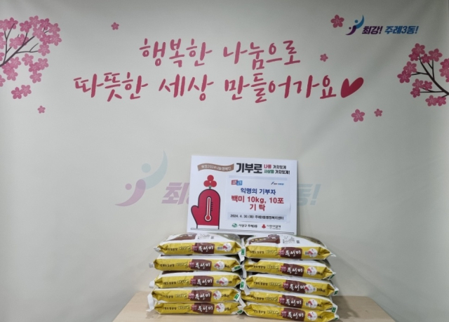 부산 사상구 주례3동(동장 김병국)은 지난달 30일 익명의 독지가로부터 백미 10kg 10포를 기탁받았다고 밝혔다.