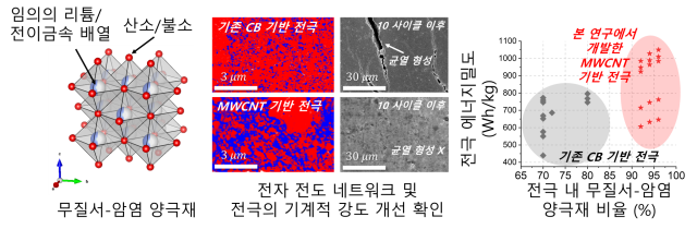 그림. 무질서-암염 양극재 전극에서 MWCNT 도전재를 통해 개선된 전자 전도 네트워크와 전극 에너지밀도. KAIST 제공