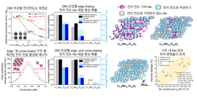 또한, DRX 양극재 내 망간 함량이 높을수록 전자전도도는 높지만, 동시에 부피 변화율도 높다는 상관관계를 발견했다. 이러한 이해를 기반으로 망간 함량을 낮춰 부피 변화를 억제하고, 다중벽 탄소 나노튜브를 사용해 낮은 전자전도도를 극복한다는 차세대 리튬이온전지 양극 설계 전략을 연구팀은 제시했다.