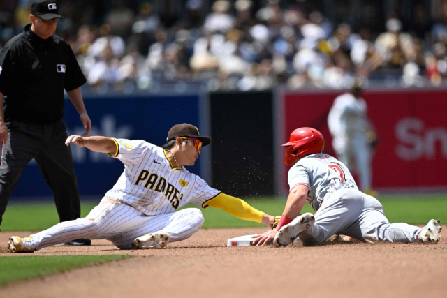 샌디에이고 파드리스 김하성이 2일(한국시간) 신시내티 레즈와 홈 경기에서 2루 도루를 시도하는 상대를 태그하고 있다. AFP연합뉴스
