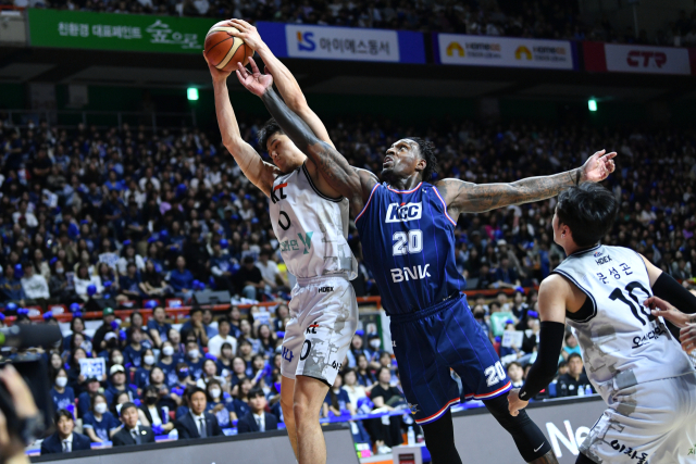 부산 KCC 라건아가 지난 1일 부산 사직실내체육관에 열린 수원 KT와 프로농구 챔피언결정 3차전에서 리바운드 다툼을 하고 있다. KBL 제공