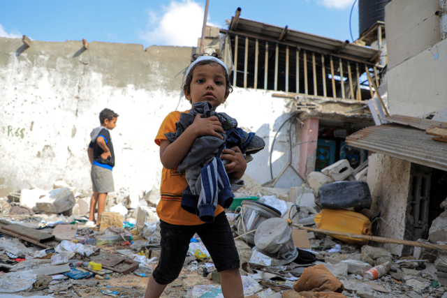 팔레스타인 어린이가 1일(현지시간) 가자지구 남부 도시 라파의 파괴된 주택 잔해 사이에서 옷가지를 줍고 있다. 신화연합뉴스