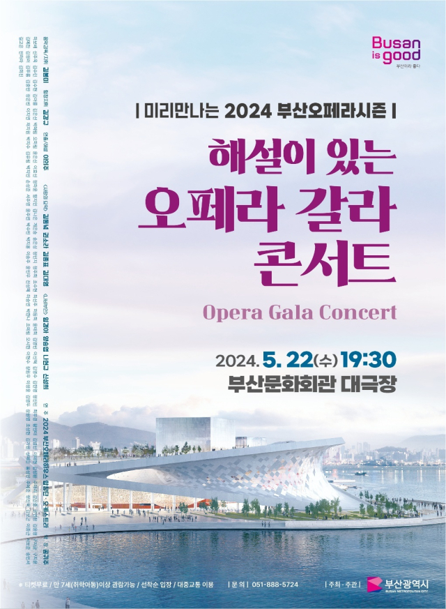 부산시가 주최·주관하는 2024 부산오페라시즌 갈라 콘서트. (재)부산문화회관이 제작하는 전막 오페라 ‘나비부인’(지휘 이병욱, 재연출 김숙영, 8월 31일~9월 1일)과 금정문화회관이 제작하는 콘서트 오페라 도니체티 ‘사랑의 묘약’(지휘 김광현, 연출 엄숙정, 9월 11~12일) 공연에 앞서 선보이는 프리뷰 오페라 갈라 콘서트이다. 전반부 ‘사랑의 묘약’ 캐스트는 아디나 소프라노 권소라, 네모리노 테너 김동녘, 벨코레 바리톤 김종표, 둘카마라 베이스 김대영, 잔네타 소프라노 김수진. 후반부 ‘나비부인’ 캐스트는 초초상(나비부인) 소프라노 임경아, 핑커톤 테너 양승엽, 샤플레스 바리톤 나현규, 하녀 스즈키 메조소프라노 신성희. ‘나비부인’의 초초상 아리아 ‘어느 개인 날’, 합창단의 ‘허밍 코러스’, ‘사랑의 묘약’의 ‘남몰래 흘리는 눈물’ 등을 들을 수 있다. 지휘 김봉미, 합창지휘 김강규, 연출·해설 이의주, 음악코치 권수빈. 연주 2024 시즌 부산오페라하우스 합창단·오케스트라(악장 공귀주). ▶5월 22일(수) 오후 7시 30분 부산문화회관 대극장. 입장 무료(선착순 입장).