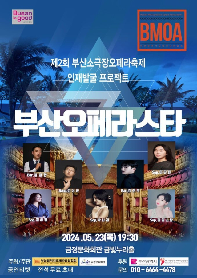부산의 16개 민간 오페라단으로 구성된 부산시오페라단연합회(회장 장진규·드림문화오페라단 단장)가 제2회 부산소극장오페라축제 부대행사로 마련하는 제2회 부산성악콩쿠르 본선 경쟁 무대. 지난 11일 동명대 음악관에서 개최된 예선에서 7명(소프라노 김하정 박나래 이유빈 김믿소랑, 바리톤 김경한 김선우, 베이스 김성균)이 입상해 23일 금정문화회관에서 ‘부산오페라스타’라는 이름으로 본선 경쟁이 펼쳐질 예정이다. 입상자에게는 상장과 상금을 주며, 제2회 부산오페라축제의 오페라 ‘돈 파스쿠알레’ ‘코지 판 투테’ ‘피가로의 결혼’ ‘사랑의 묘약’ 주, 조연으로 출연하게 된다. ▶5월 23일(목) 오후 7시 30분 금정문화회관 금빛누리홀. 전석 무료 초대.