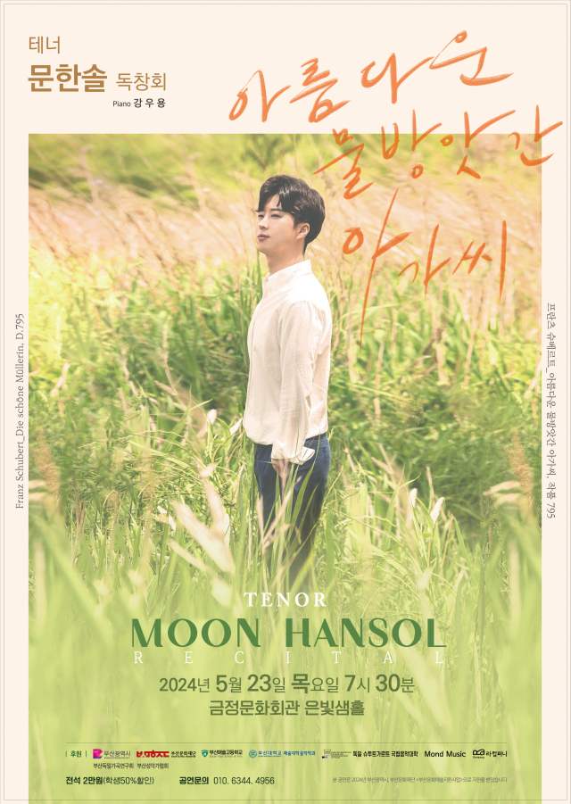 부산예고와 부산대를 졸업한 뒤 마산시립합창단(현 창원시립합창단) 테너 상임단원으로 활동하던 중 도독해 슈투트가르트 국립음대 오페라과 석사과정을 졸업한 테너 문한솔의 독창회. 빌헬름 뮐러의 시에 곡을 붙인 연가곡집 ‘아름다운 물방앗간 아가씨’로 프로그램을 꾸민다. 이 연가곡은 방랑자의 즐거운 마음을 묘사하는 것을 시작으로 방앗간집 딸과 사랑에 빠지고 실연을 당하자 괴로움에 자살하게 되는 비극적인 내용을 다양한 감정과 섬세한 표현으로 20개의 곡에 풀어낸다. 풍부한 멜로디와 함께 서정적인 내용으로 슈베르트 일생에 큰 획을 긋는 의미 있는 작품이라는 평가를 받고 있지만 1시간이 넘는 대곡이며, 사랑으로 인해 느끼는 다양한 감정의 전환을 섬세하게 표현하고 전달하기 쉽지 않은 곡이라 전곡을 연주하는 경우가 드물다. 피아노는 부산대 선후배 사이인 강우용이 맡았다. ▶5월 23일(목) 오후 7시 30분 금정문화회관 은빛샘홀. 입장료 2만 원.