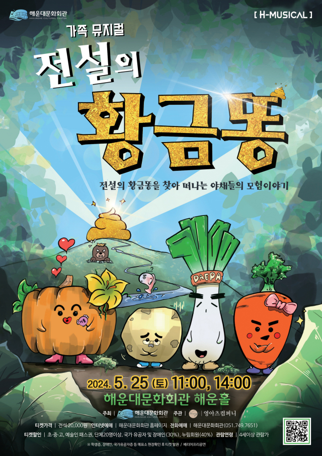 가족 뮤지컬 ‘전설의 황금똥’은 아이들의 장난으로 죽어가게 된 야채밭의 오염으로부터 살아남은 대파, 당근, 양파, 늙은 호박이 죽어가는 야채 친구들을 살리기 위해 전설의 거름 황금똥을 찾으러 가면서 겪게 되는 모험을 다룬다. 똥, 방구, 동물 등 아이들에겐 언제나 인기 만점인 소재들로 구성됐으며, 관객들(어린이들)의 응원과 호응으로 모험을 이겨내는 체험형 공연으로 연출한다. ▶5월 25일(토) 오전 11시, 오후 2시 해운대문화회관 해운홀. 4세 이상 관람가. 관람 시간 60분. 입장료 전석 2만 원.