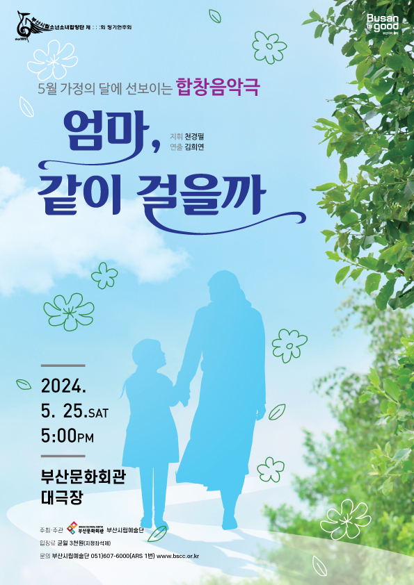 새로운 50주년(1973년 창단)을 시작하는 부산시립소년소녀합창단이 가정의 달 5월을 맞아 가족이 함께할 수 있는 ‘합창 음악극’을 선보인다. 이번 무대는 천경필 수석지휘자의 지휘로 솔로, 중창, 합창 등 다양한 편성으로 전체 8개의 에피소드로 구성한다. 이번 무대는 사춘기가 시작된 딸과 엄마가 서로의 마음을 이해하고 알아가는 과정을 음악과 연기, 영상으로 만든다. 매일 반복되는 엄마와 사춘기 딸의 싸움으로 둘은 지쳐버린 상태. 매사를 모범생인 남동생과 비교하는 엄마와 다툰 후 홧김에 딸은 집을 나간다. 엄마는 딸의 행방을 알아보려 수첩을 뒤지다가 아기 때 딸의 모습을 발견하고 추억에 젖는다. 한편 딸은 친구들과 만나 각자의 괴로움을 이야기하며 마음을 달랜다. 집으로 돌아가는 중 길에서 울고 있는 아이(엄마)를 만나고, 엄마가 된 나를 만나기도 하며 엄마를 이해하게 된다는 내용이다. 지휘 천경필 수석지휘자, 연출·대본 김희연, 연기 지도 이현주(부산시립극단 상임단원), 출연 단체 부산시립소년소녀합창단, 이사라(객원 배우), 김보은(신시사이저, 김진훈·김은호(타악기). ▶5월 25일(토) 오후 5시 부산문화회관 대극장. 관람 대상 만 6세 이상 입장 가능. 입장료 R석 3000원, S석 2000원.