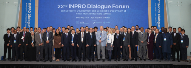 이창윤 과학기술정보통신부 제1차관(앞줄 왼쪽 11번째)이 7일 오전 제주특별자치도 제주국제컨벤션센터에서 열린 '제22차 국제원자력기구(IAEA) 혁신원자로 및 핵연료 국제공동프로젝트(INPRO) 대화 포럼 개회식'에서 미하일 추다코프(Mikhail Chudakov) IAEA 원자력에너지부 사무차장(앞줄 오른쪽 11번째) 및 참석자들과 기념촬영하고 있다. 과기정통부 제공