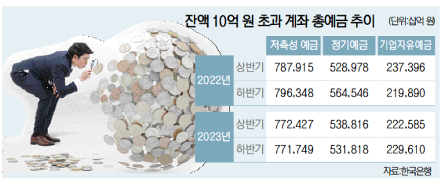 10억 원 초과 고액 예금 잔액은 2018년 상반기 500조 원, 2019년 하반기 600조 원, 2021년 상반기 700조 원을 차례로 돌파하며 증가세를 이어왔으나 800조 원을 목전에 두고 후퇴했다. 이 잔액이 두 반기 연속으로 줄어든 것은 한은이 지난 2002년 상반기부터 관련 통계를 작성한 이래 처음이다.