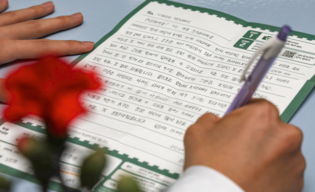 어버이날을 하루 앞둔 7일 오후 부산 동래구 용인고등학교에서 학생들이 부모님께 감사의 편지를 쓰고 있다. 학생들은 카네이션과 직접 쓴 감사의 편지를 부모님께 전달할 예정이다.