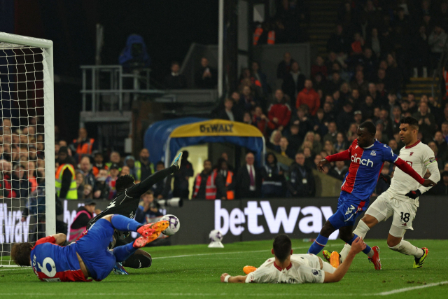 크리스털 팰리스의 타이릭 미첼(오른쪽 두 번째)이 7일(한국시간) 영국 런던의 셀허스트 파크에서 열린 맨체스터 유나이티드와의 2023-2024 잉글랜드 프로축구 프리미어리그(EPL) 36라운드 홈 경기에서 득점을 올리고 있다. 이날 크리스털 팰리스의 미드필더인 마이클 올리세에게 멀티골을 내주며 0-4로 대패한 맨유는 한 시즌 ‘EPL 최다 패배+공식전 최다 실점’의 굴욕을 동시에 맛봤다. AFP연합뉴스