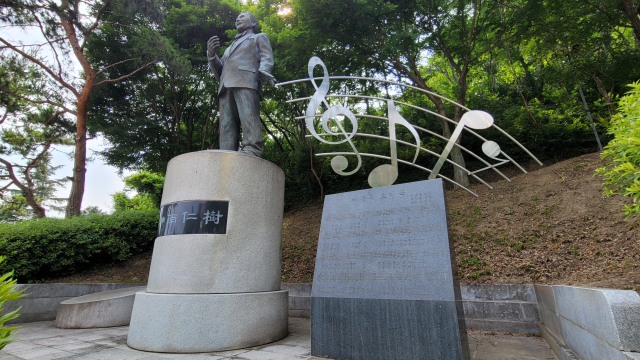 경남 진주시 진양호공원에 세워져 있는 남인수 동상. 비석에는 그의 대표곡인 애수의 소야곡이 새겨져 있다. 김현우 기자