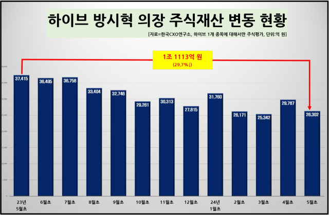 특히 방시혁 의장의 주식평가액을 지난해 5월 2일 3조 7415억 원 대비 이달 초와 비교해보면 무려 1조 1113억 원(29.7% 하락) 이상 쪼그라들었다. 1년 새 하이브의 주식가치가 30% 정도 낮아지면서 방시혁 의장의 주식평가액도 1조 원 이상 감소했다.